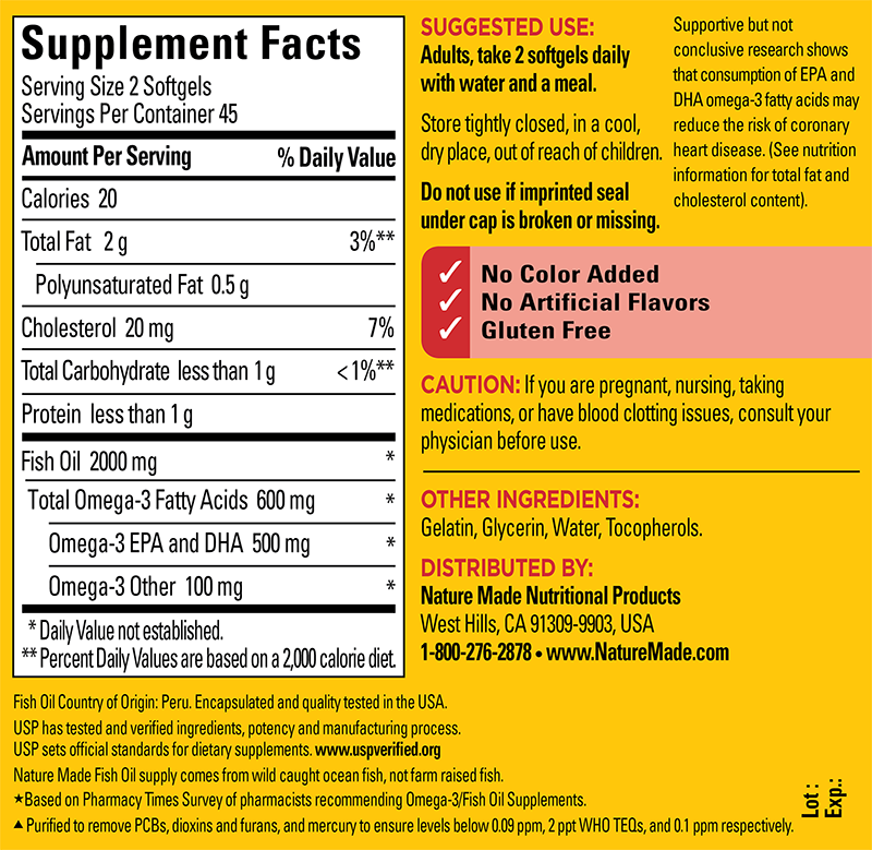 Taking nature made fish oil can actually help to improve the condition of your skin, as the epa in the fish oil is one of the most important fatty acids the best thing about the fish oil capsules is that there is nowhere near as much fishy taste as in the plain liquid fish oil. Each capsule contains a lot of fish oil—2000 mg—but the amount of omega 3 fatty acids is mediocre. Freeze your fish oil capsules before consuming. Taking nature made fish oil can actually help to improve the condition of your skin, as the epa in the fish oil is one of the most important fatty acids the best thing about the fish oil capsules is that there is nowhere near as much fishy taste as in the plain liquid fish oil.